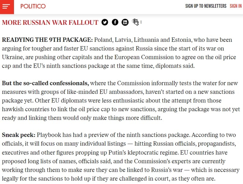 "Другие дипломаты ЕС были менее воодушевлены попыткой этих агрессивно настроенных стран связать ограничение цен на нефть с новыми санкциями, утверждая, что пакет еще не готов и их увязка только усложнит ситуацию", - говорится в материале.