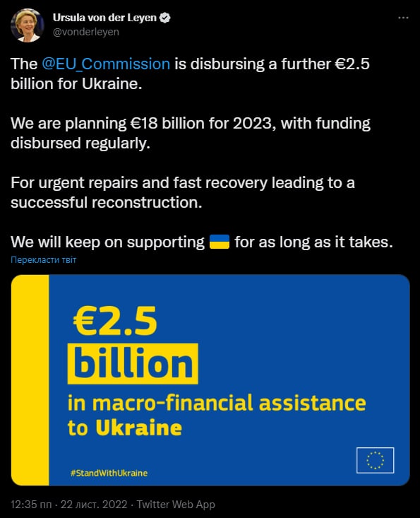 • Сообщил, что ЕС выделил 2,5 млрд евро макрофинансовой помощи и обсуждает программу выделения 18 млрд евро в 2023 году. А Штаты дадут Украине 4,5 млрд долларов.