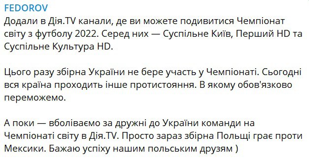 18.55 В Дия.ТV добавили телеканалы, на которых можно посмотреть чемпионат мира по футболу 2022, – Суспильне Киев, Первый HD и Суспильне Культура HD.