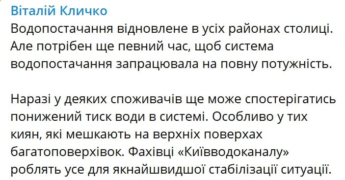 Днем в четверг, 24 ноября, в Киеве восстановили водоснабжение, которое после вчерашней российской массированной атаки пропадало во всех районах города.