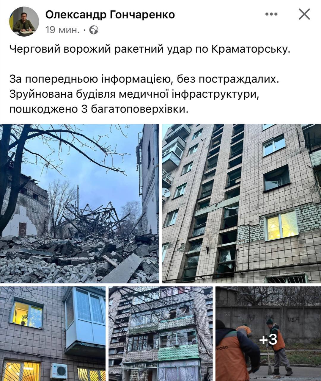 "Разрушено здание медицинской инфраструктуры, повреждены три многоэтажки", — сообщил Гончаренко.