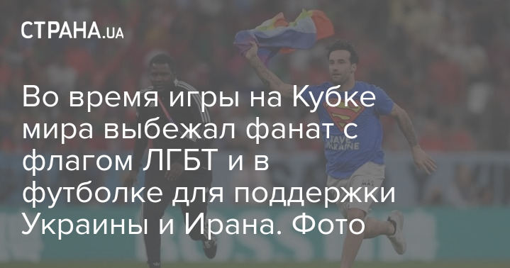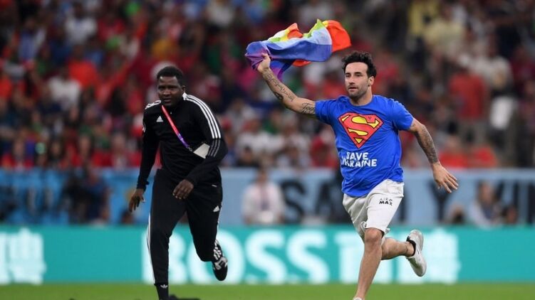 Во время только что закончившегося матча Кубка мира в Катаре Португалия – Уругвай на поле выбежал фанат в футболке со слоганами в поддержку Украины и женщин Ирана, а также с флагом ЛГБТ в руках.