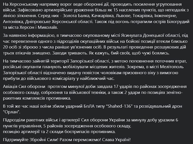 Авиация Сил обороны за прошедшие сутки нанесла 17 ударов по районам сосредоточения личного состава, вооружения и военной техники, а также 2 удара по позициям зенитно-ракетных комплексов противника. Украинские военные сбили ударный БпЛА типа Shahed-136 и разведывательный дрон Орлан.