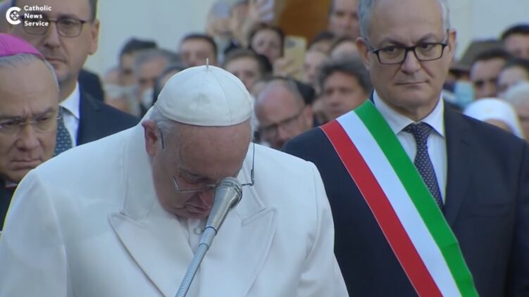 Присутствующие во время молитвы, включая мэра Рима Роберто Гуалтьери, начали аплодировать. Папа римский хранил молчание около 30 секунд, после чего продолжил дрожащим голосом: "Но вместо этого я должен вам еще раз принести мольбы детей, стариков, отцов и матерей, молодых людей этой мученической земли, которая столь много страдает".
