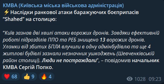 9:00 Киевская военная администрация заявляет, что сбито уже 13 дронов-камикадзе.