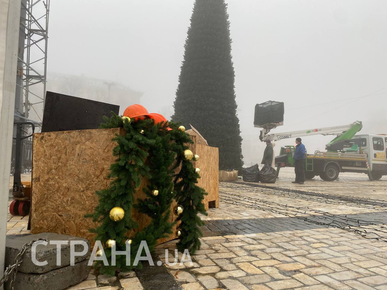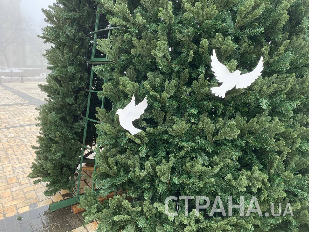 На верхушке елки уже установлен Трезубец (вместо традиционной звезды), а на ветки начинают развешивать елочные игрушки. В этом году главную елку украсят желтыми и синими шарами, которые образуют на елке флаг Украины, а вокруг него разместят фигурки белых голубей.