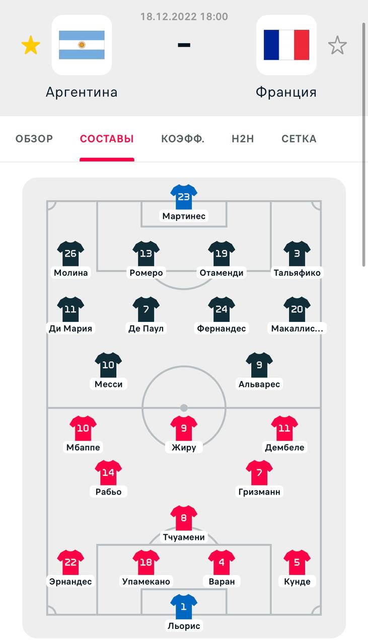 Франция может стать первой сборной за 60 лет, которой удастся защитить чемпионский титул. Аргентина же мотивирована желанием получить последний заветный трофей для своего лидера Лео Месси, который за свою выдающуюся карьеру выиграл все, кроме ЧМ. 35-летняя легенда уже объявила, что покинет сборную после этого мундиаля.