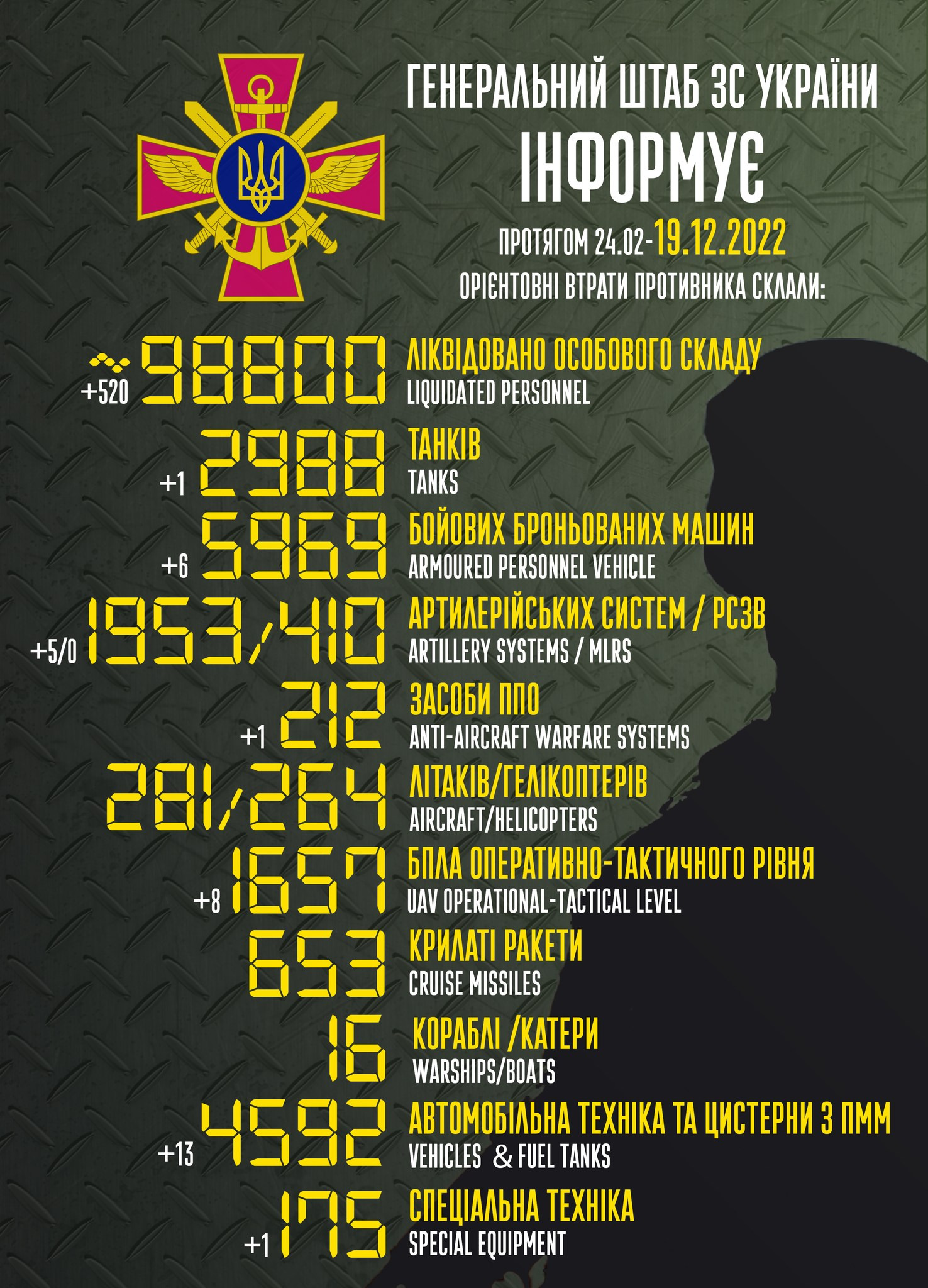 Генштаб Вооруженных сил Украины озвучил общие боевые потери российской армии за время войны в Украине - с 24 февраля по 19 декабря.