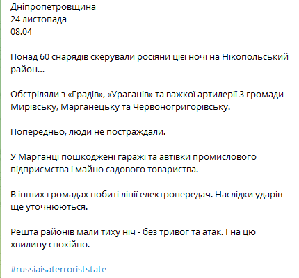 "В Марганце повреждены гаражи и авто промышленного предприятия и имущество садового общества. В других громадах разбиты линии электропередач. Последствия ударов еще уточняются. В остальных районах ночь прошла тихо - без тревог и атак. И в эту минуту спокойно", - написал Резниченко.