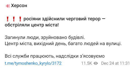 В субботу, 24 декабря, россияне обстреляли центр Херсона. Известно минимум о пятерых погибших и 20 пострадавших.
