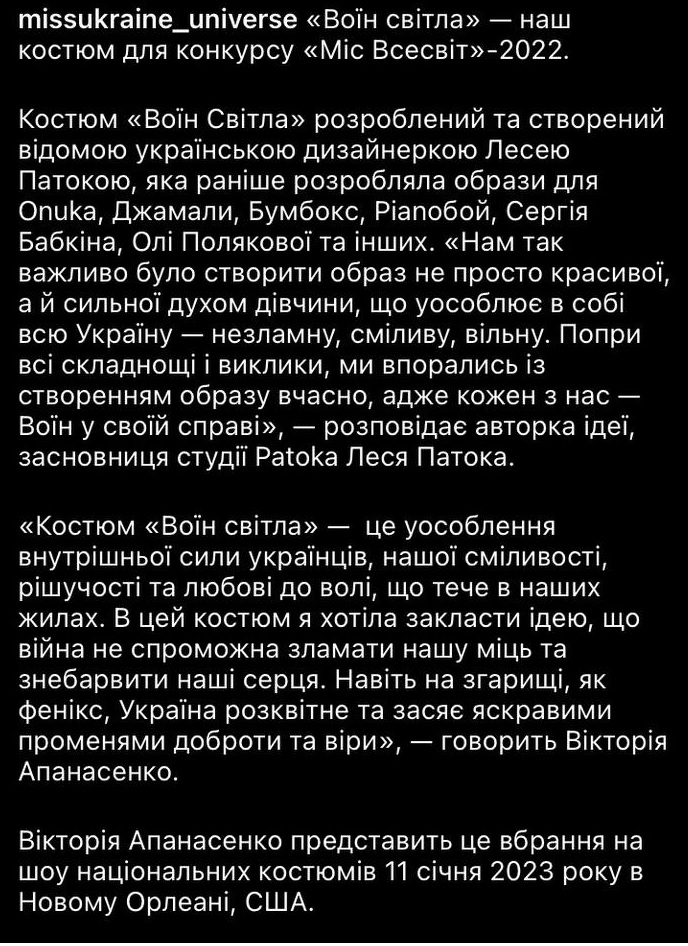 По словам автора, костюм символизирует борьбу украинцев с тьмой и оберегает их, как Архангел Михаил, защищающий Украину.