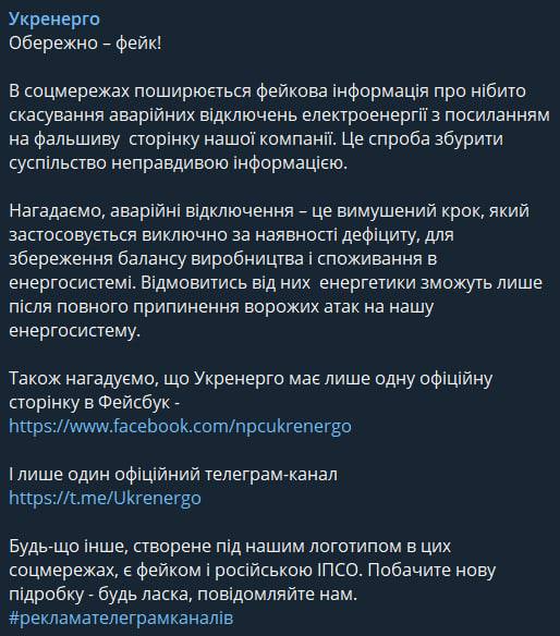 В "Укрэнерго" обращают внимание, что сообщение о якобы отмене аварийных отключений распространяется со ссылкой на фейковую страницу компанию.