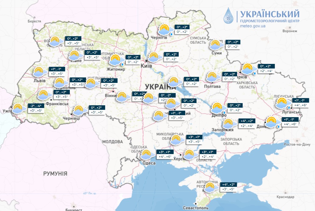 07.00 Сегодня в Украине переменная облачность без существенных осадков. Температура в течение дня будет колебаться от -2 до +5.