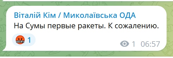 07:58 Первые российские ракеты летят в сторону Сум, заявил губернатор Николаевской области Виталий Ким.