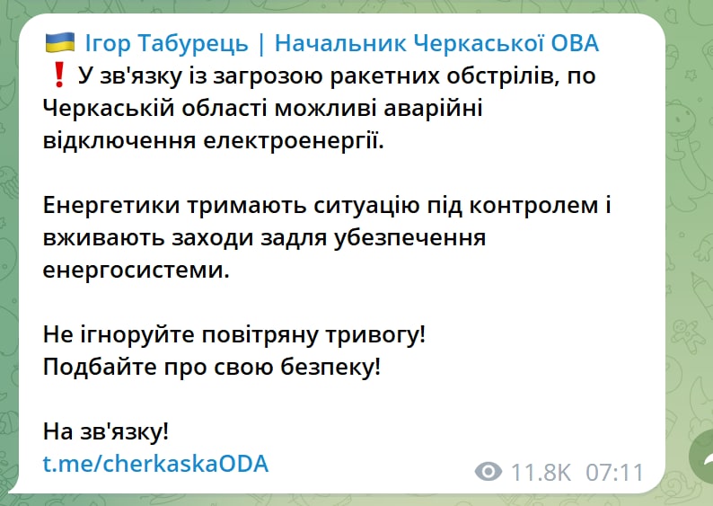 08:14 В Черкасской области предупредили жителей об аварийных отключениях энергии.