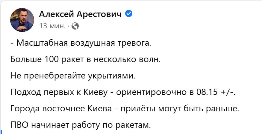09:23 Арестович предупреждает еще о 2-3 новых волнах ракетных атак.