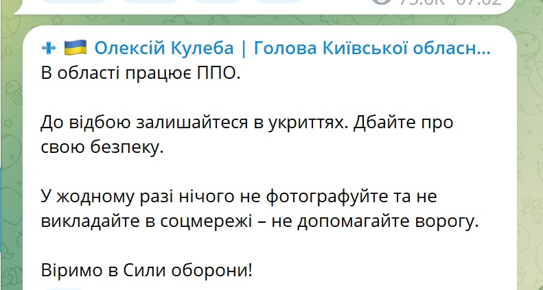08:44 Работу ПВО в Киевской области подтвердил губернатор Кулеба.