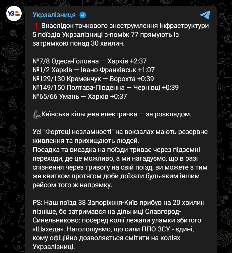 08:54 Хотя о прилетах официально не сообщалось, "Укрзализныця" уже пишет о том, что частично обесточена инфраструктура и начались задержки поездов.