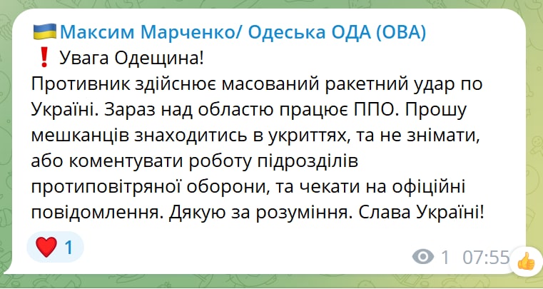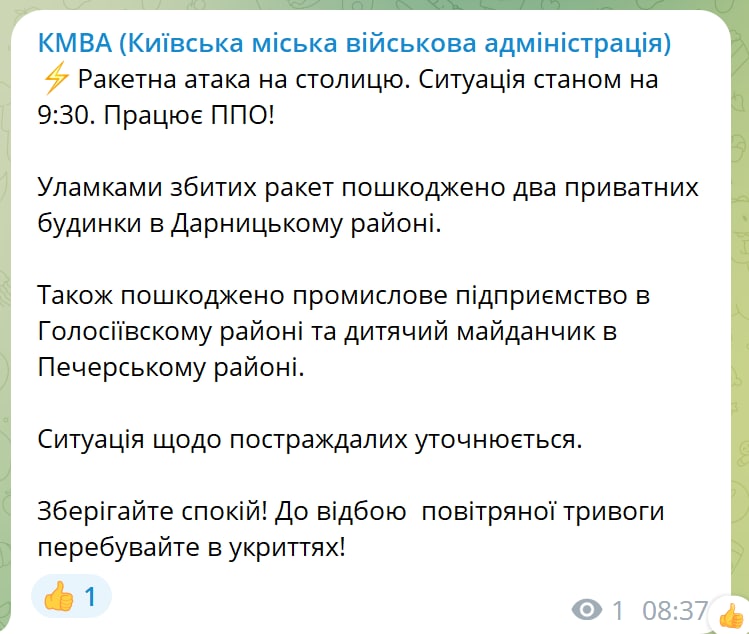 Напомним, губернаторы сообщили о пуске ракет по Украине этим утром.