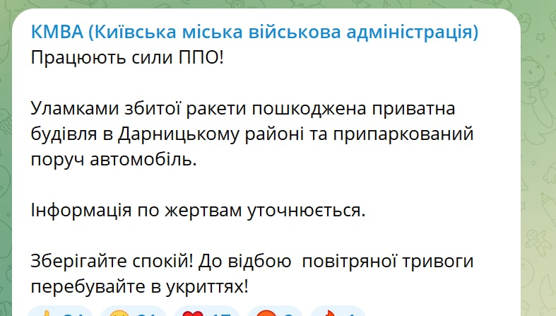 08:16 Пишут о работе ПВО на границе Киевской и Черниговской областей.