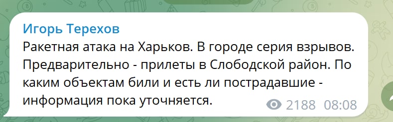 09:09 Мэр Харькова подтвердил обстрел. Предварительно прилеты по Слободскому району.