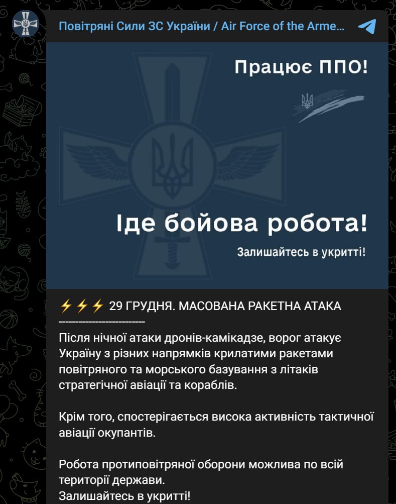 09:12 Воздушные силы Украины сообщают, что ракетная атака идет с разных направлений, как с воздуха, так и с моря. ПВО работает по всей стране.
