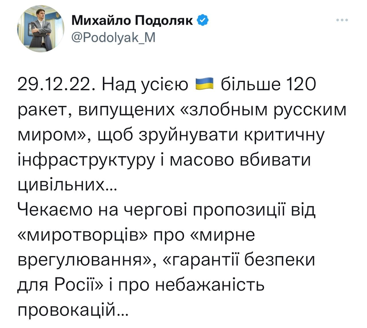 • Поблагодарил ПВО и Воздушные силы за отражение ракетной атаки. Рассказал, что было несколько прилетов, поэтому сейчас отключения есть в ряде регионов. Сложнее всего в Киеве и области, Одессе и области, Львовской области, Херсоне и области, Винницкой области и в Закарпатье. Допустил, что россияне могут еще раз попробовать нанести удар до Нового года.