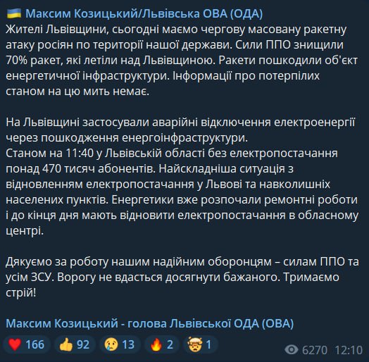 20:53 Одним из наиболее пострадавших городов от сегодняшних ракетных ударов стал Львов. Там были массовые отключения света.