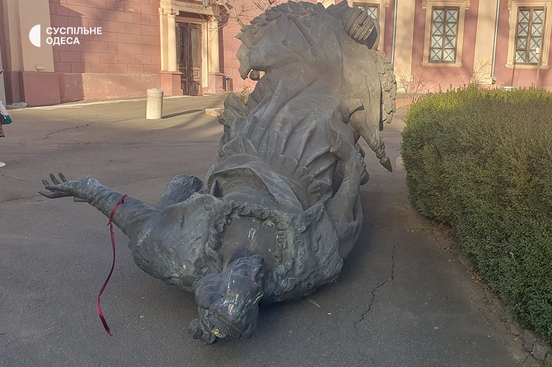 07:40 Фото демонтированного памятника Екатерине Второй и другим основателям Одессы.