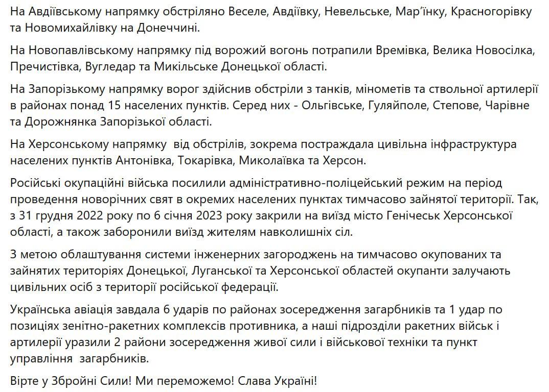 В Генеральном штабе Вооруженных сил Украины опубликовали оперативную сводку с фронта по состоянию на вечер субботы, 31 декабря.