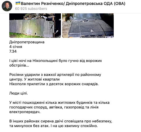 РФ этой ночью обстреляла из тяжелой артиллерии Никополь. По жилым кварталам было выпущено порядка 10 снарядов.