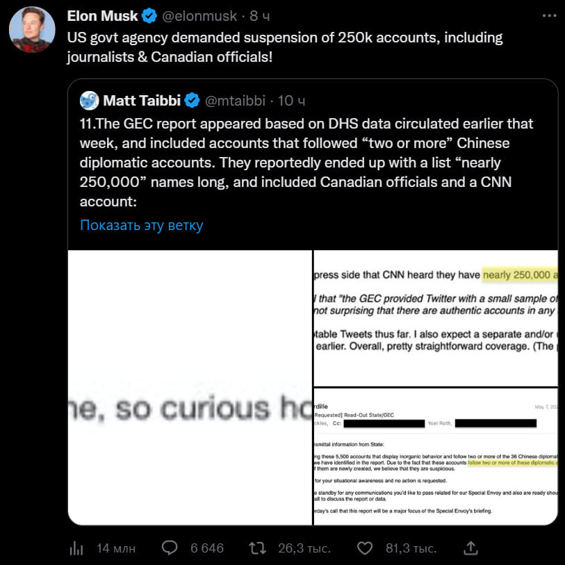 "Агентство правительства США потребовало заблокировать 250 тысяч аккаунтов, включая журналистов и канадских чиновников", - написал Маск в комментарии журналисту Мэтту Тайбби, опубликовавшему расследование.