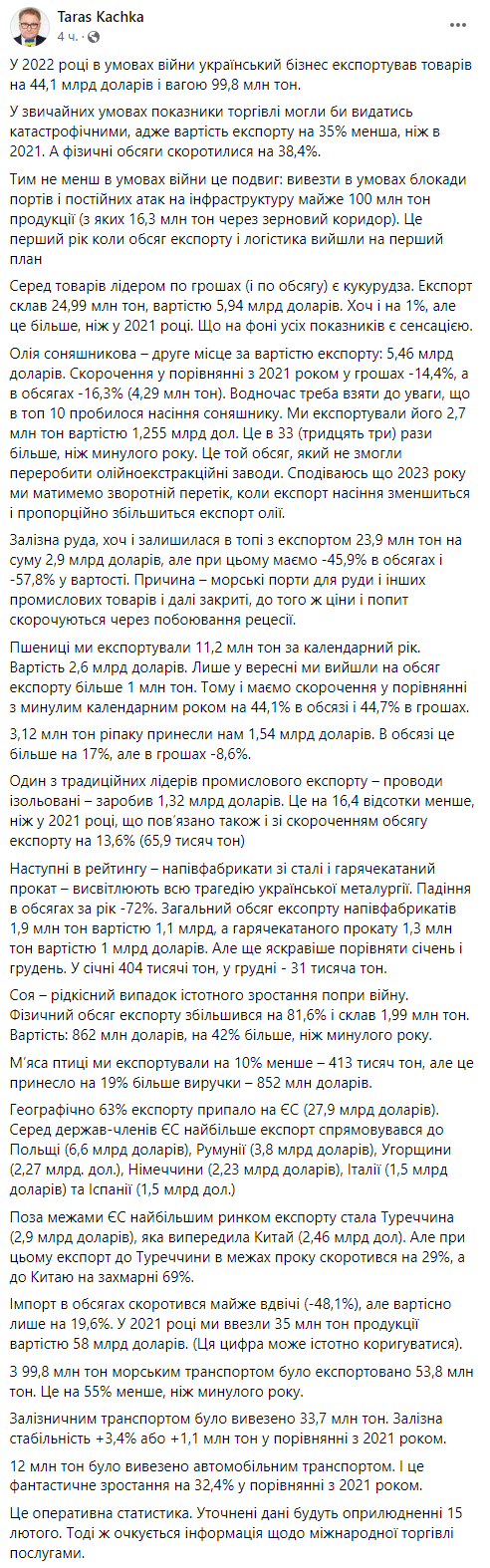 В 2022 году в условиях войны украинский бизнес экспортировал товаров на 44,1 млрд долларов и весом 99,8 млн тонн. По словам заместителя министра экономики – торгового представителя Украины Тараса Качки, это первый год, когда объем экспорта и логистика вышли на первый план.