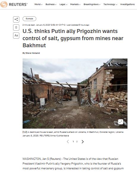06.30 Глава ЧВК "Вагнер" Пригожин заинтересован в том, чтобы получить контроль над соляными и гипсовыми месторождениями около Бахмута.