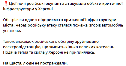 Также в результате российского обстрела разрушена электроподстанция, питающая несколько больших котельных. Подача тепла и света в Херсоне не прекращалась.