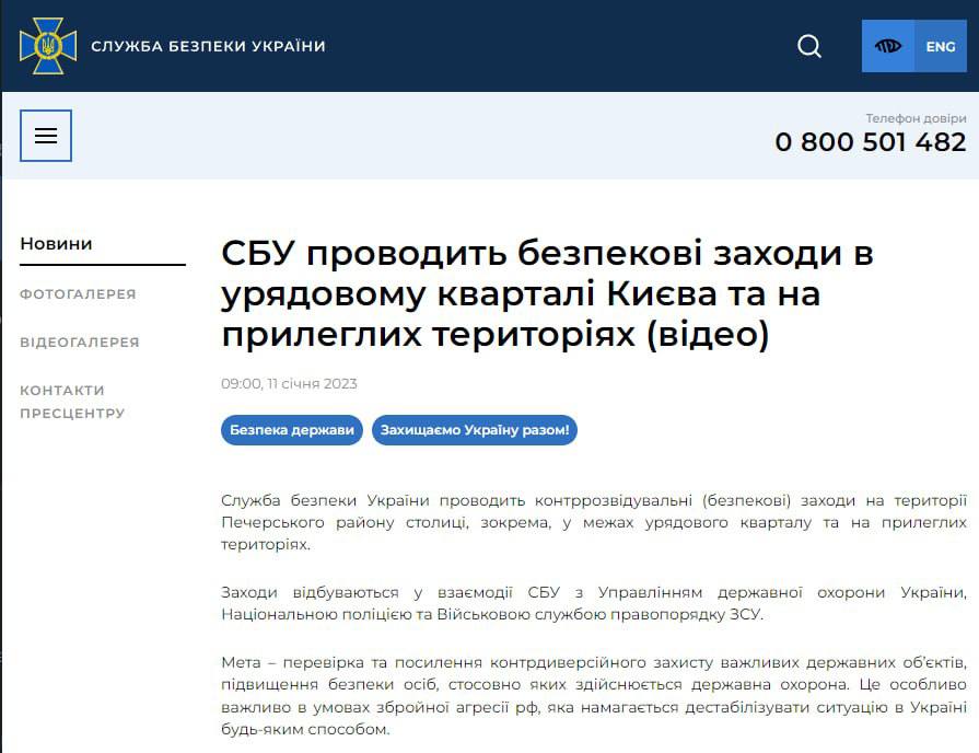 09.35 СБУ сообщает, что проводит контрразведывательные мероприятия "на территории Печерского района столицы, в частности, в пределах правительственного квартала и на близлежащих территориях".