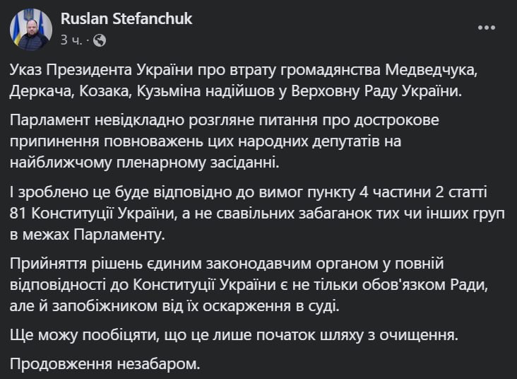 11.45 В Раду поступил указ Зеленского о лишении нардепов Виктора Медведчука, Андрея Деркача, Тараса Козака и Рената Кузьмина гражданства.