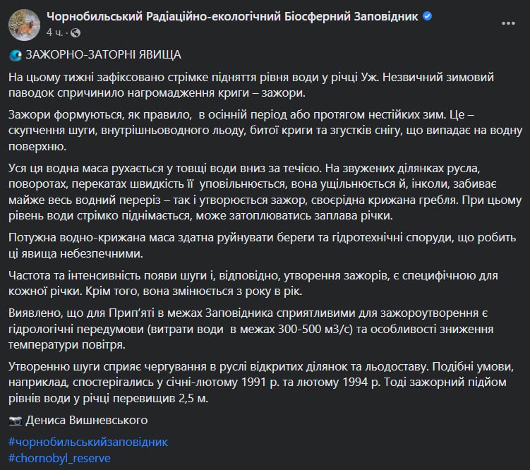На этой неделе в Чернобыльской зоне зафиксировали стремительное поднятие уровня воды в реке Уж - правом притоке Припяти, впадающем в Киевское водохранилище. Необычный зимний паводок повлек за собой накопление льда - зажоры.