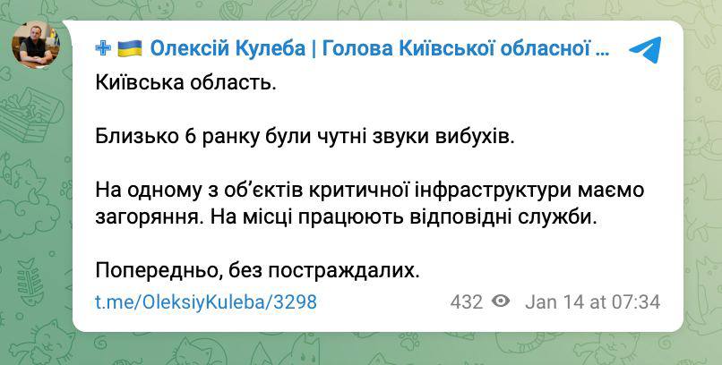 07:40 После взрывов сегодня утром на одном из объектов критической инфраструктуры в Киевской области есть возгорание. На месте работают соответствующие службы, сообщает глава Киевской ОВА Кулеба.