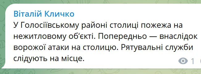 10:49 В Голосеевском районе пожар на нежилом объекте. Предварительно - вследствие ракетной атаки на Киев, сообщил Кличко.