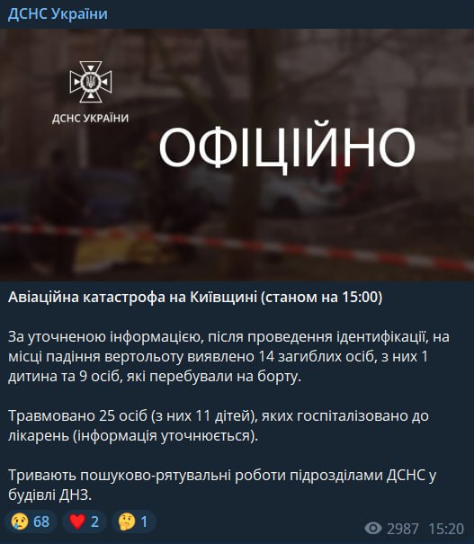 14 погибших, среди них один ребенок. В ГСЧС уточнили данные о жертвах авиакатастрофы в Броварах