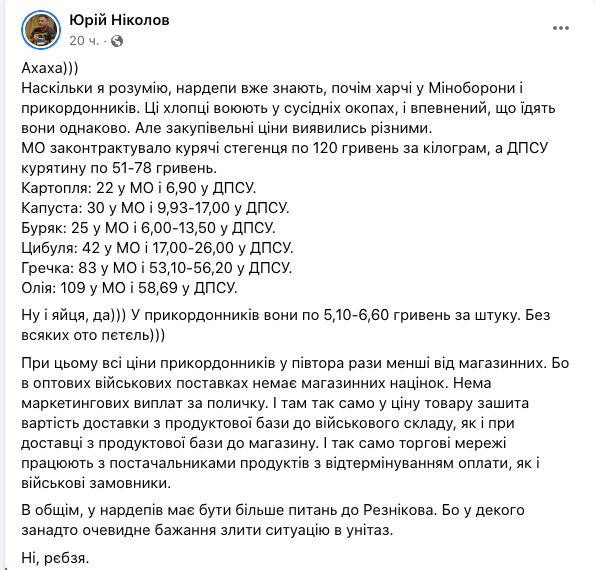 "Все цены пограничников в полтора раза меньше магазинных. Ибо в оптовых военных поставках нет магазинных наценок. Нет маркетинговых выплат за полочку. И там так же в цену товара зашита стоимость доставки из продуктовой базы в военный склад, как и при доставке из продуктовой базы в магазин", - написал он.