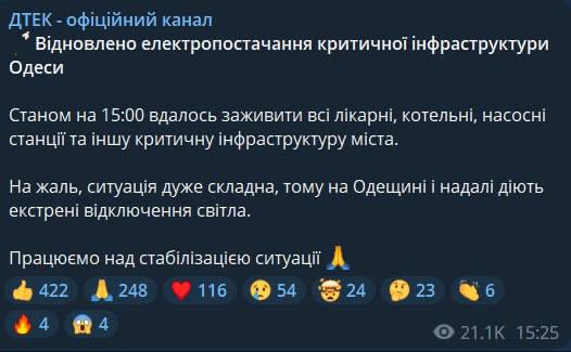 В Одессе возобновлено электроснабжение критической инфраструктуры после сегодняшнего ракетного удара РФ.