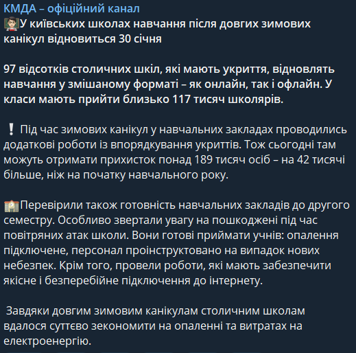 В школах Киева обучение после длинных зимних каникул возобновляется 30 января. 97% школ с укрытиями восстановят работу в смешанном формате онлайн/оффлайн, за парты сядут 177 тысяч школьников.