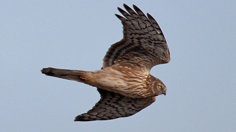 Во время охоты лунь низко и бесшумно летит над землёй, высматривая добычу.
