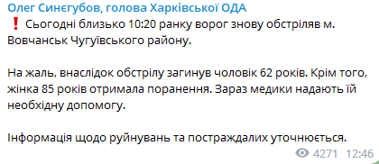 Сегодня около 10:20 враг снова обстрелял Волчанск Чугуевского района Харьковской области. В результате обстрела погиб мужчина 62 лет.