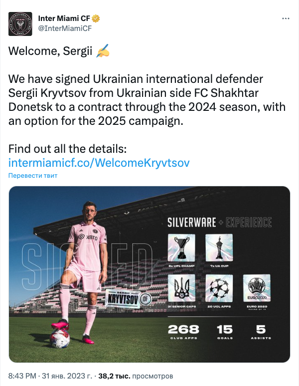 Еще один украинский футболист покидает отечественный чемпионат в это трансферное окно. Центральный защитник "Шахтёра" Сергей Кривцов переходит в американский клуб легендарного футболиста Дэвида Бекхэма "Интер Майами".