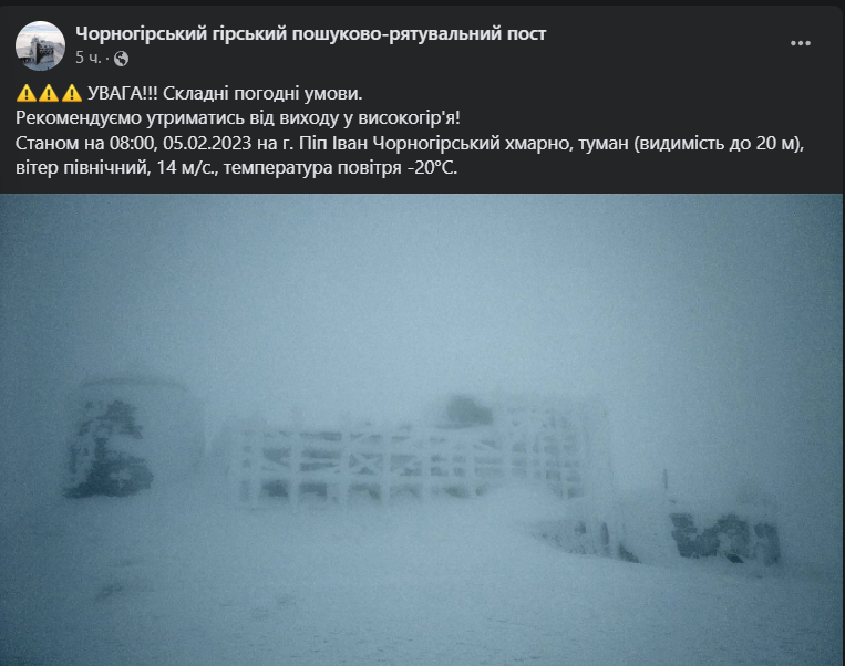 По состоянию на 08:00 на горе Поп Иван была облачная погода и сильный туман, видимость упала до 20 метров.