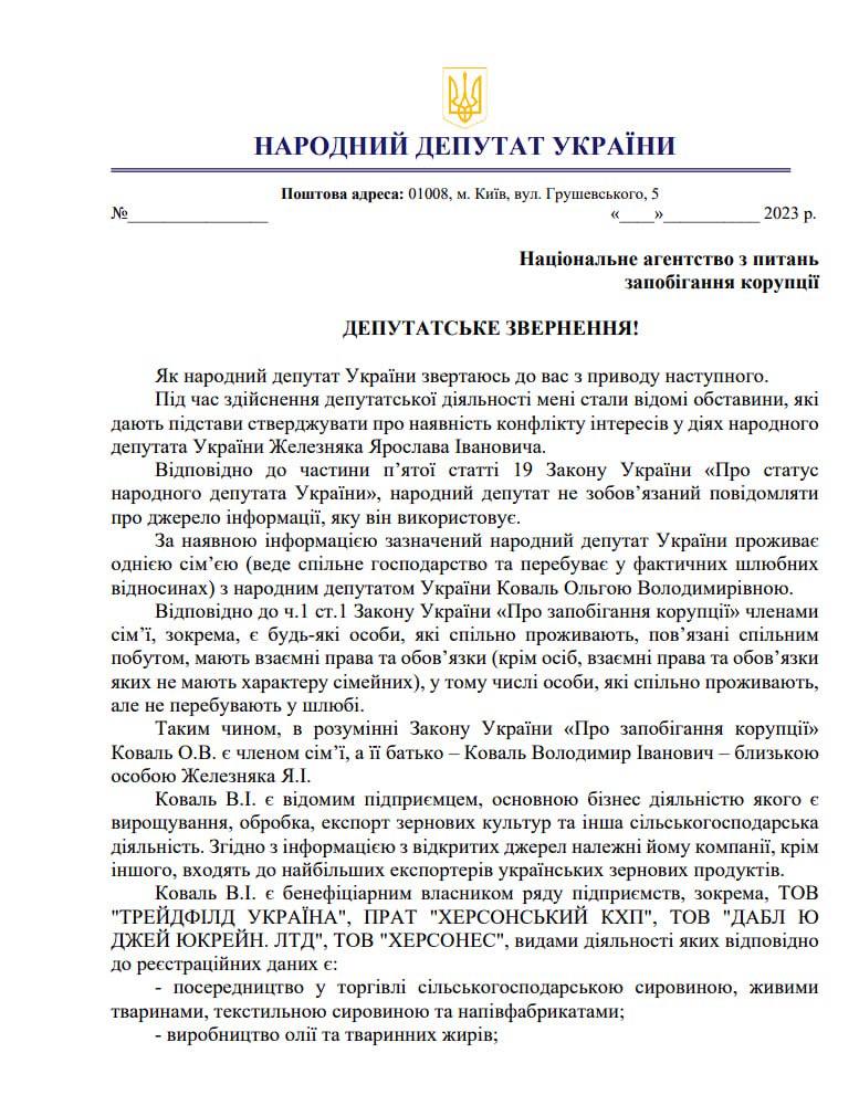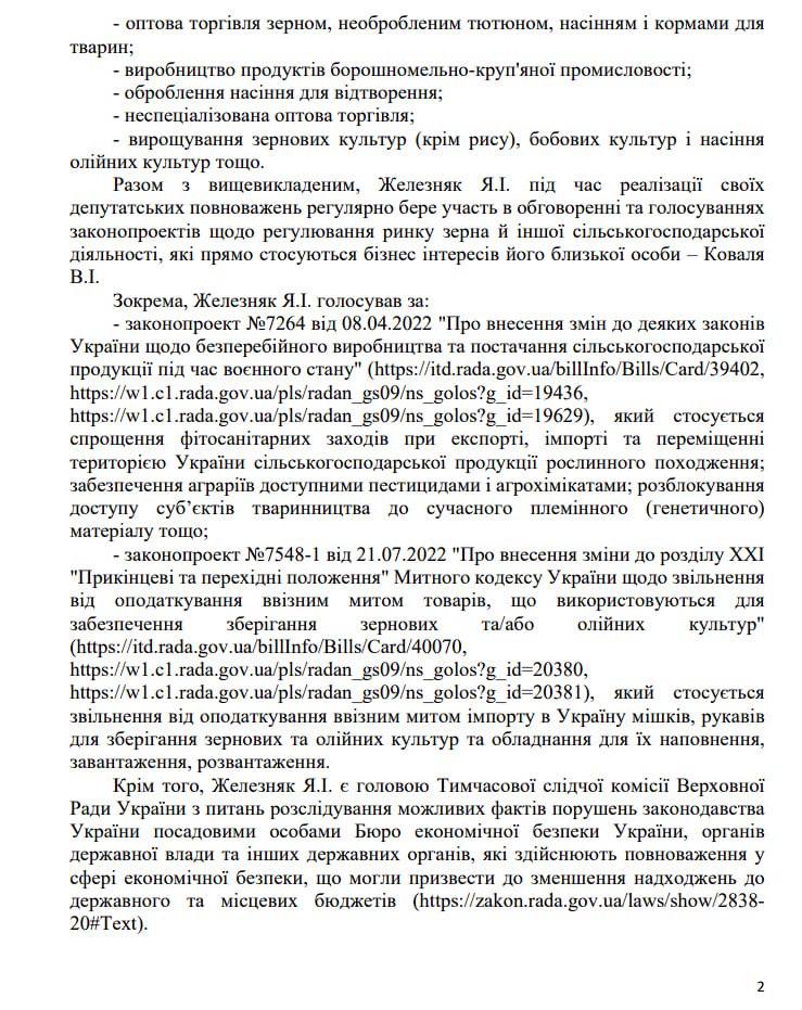 Также Железняк является главой ТСК, осуществляющей парламентский контроль за деятельностью таможенной службы, "с которой непосредственно контактируют компании Коваля во время экспорта сельхозпродукции", а значит "прямо влияют на предпринимательскую деятельность его близкого лица".