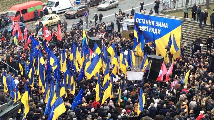 Как передает корреспондент "Страны", у стадиона имени Лобановского собралось около пяти сотен человек. На митинге установленная сцена с лозунгом"Последняя зима этой Рады". У людей в руках флаги Украины и Евросоюза. Один флаг Грузии.